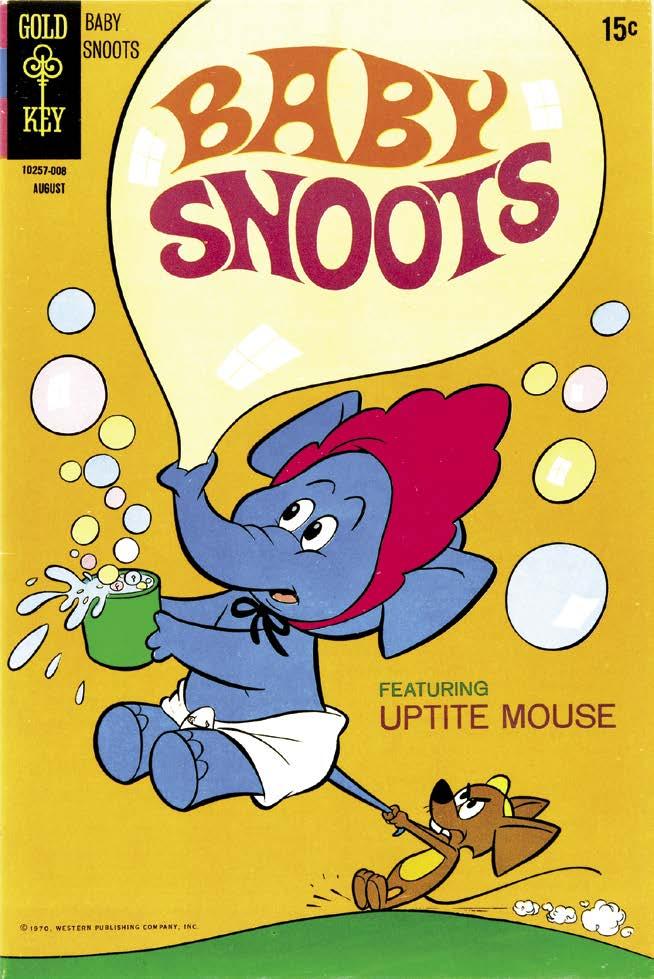 Just past the Scarewood Forest lies the town of Trunksville, USA. There, at 711 Maple Street, you will find the home of the Elephant family: Elbert Elias Elephant (better known as Papa Dear), his wife Mama Dear, their son Baby Snoots, and “houseguest” Uptite Mouse. Baby Snoots and family entertained children four times a year for 22 issues from 1970 to 1975 as one of the few company-owned properties at Gold Key Comics.