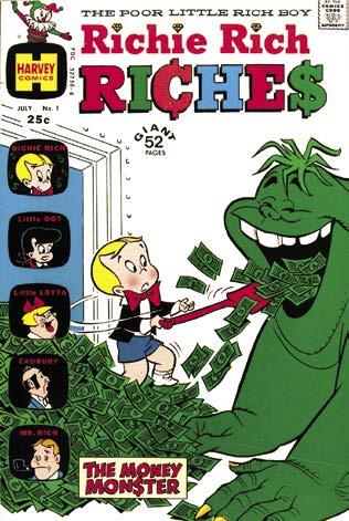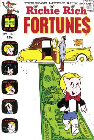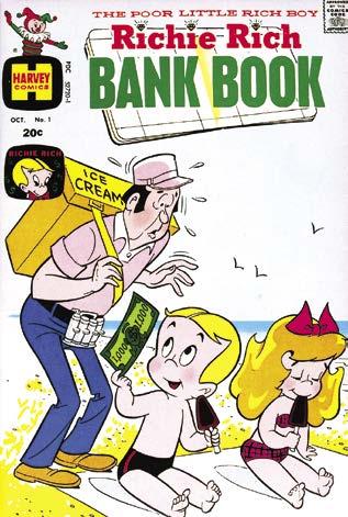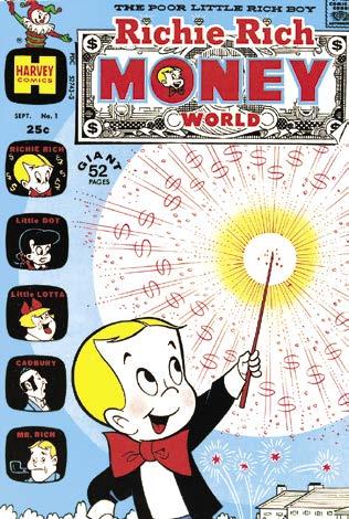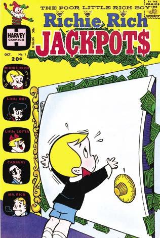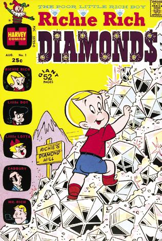 Harvey’s poor little rich boy may have been a minor character in his early days, but beginning in the early 1970s Richie Rich spinoffs became common—including these first issues: (top) Richie Rich Fortunes #1 (Sept. 1971) and Richie Rich Riches #1 (July 1972); (center) Richie Rich Diamonds #1 (Aug. 1972) and Richie Rich Money World #1 (Sept. 1972); (bottom) Richie Rich Bank Book #1 (Oct. 1972) and Richie Rich Jackpots #1 (Oct. 1972).