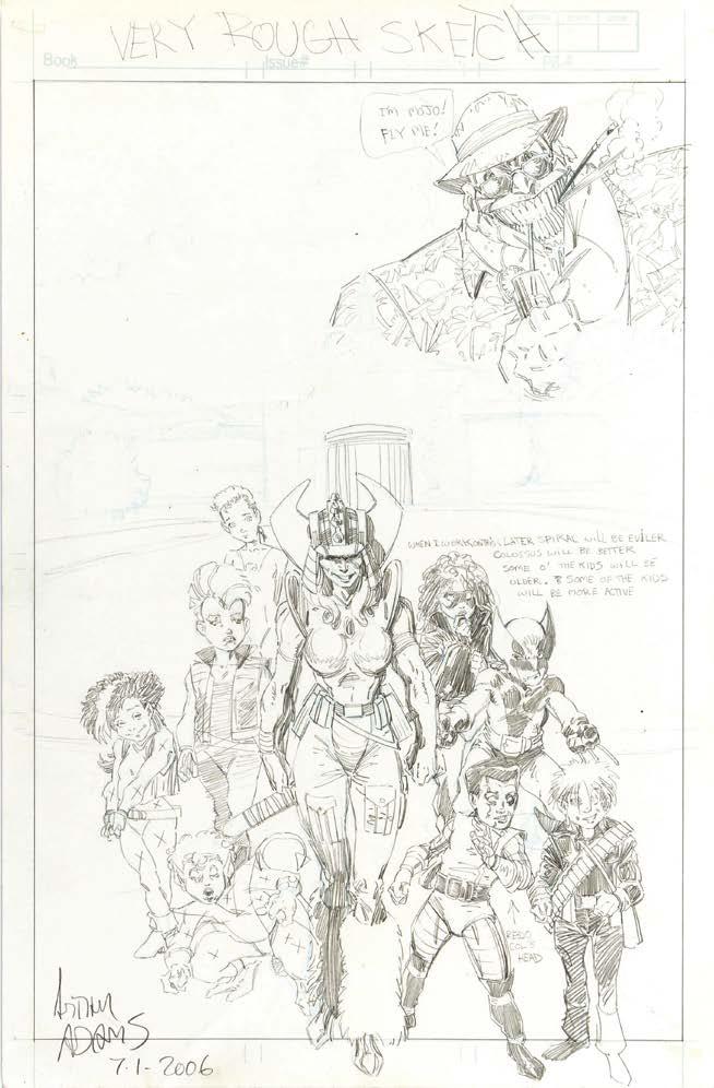 A pencil sketch by Arthur Adams, circa the mid-1980s but signed by the artist in 2006, of the X-Babies and Spiral, with a mirthful Mojo sketch in the top corner. Courtesy of Heritage Auctions (www.ha.com).