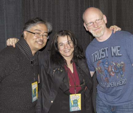 Longshot creative team Whilce Portacio, Ann Nocenti, and Arthur Adams, at a 2015 convention.