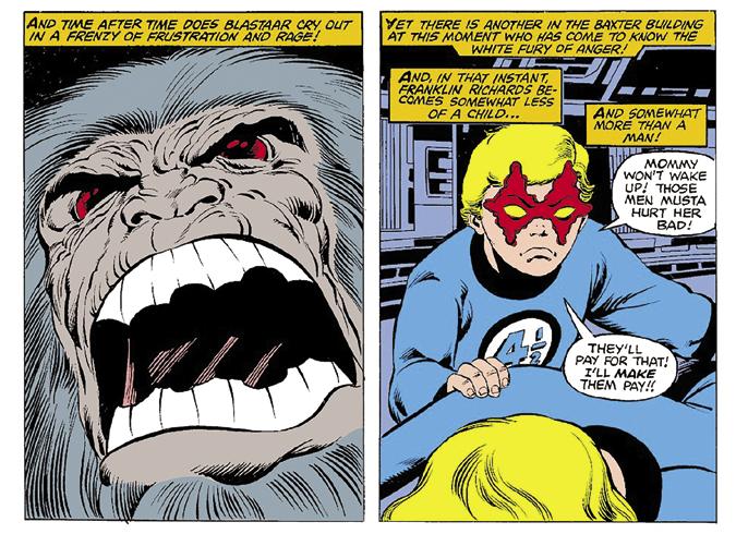 Mr. Fantastic and the Invisible Woman of the Fantastic Four—has had a storied life since his first appearance (and birth) in Fantastic Four Annual #6 (Nov. 1968). In the 56 years of his character’s life from infancy to his teen years, Franklin has been accelerated and then de-aged (twice), placed in a coma, served as an X-Man, been a freedom fighter in an alternate timeline (twice), been babysat by Agatha Harkness, and a god, with many stops in between. While placing children in dangerous situations and cliffhangers is a staple of the comics medium, certainly being the son of two superheroes meant a stressful life ahead for Franklin. But it wasn’t only the demands of the storytelling that exposed Franklin to danger, it was the ever-changing stable of creators that struggled to find a specific role for the child. Each character eventually settles into a stereotype or two (Johnny Storm is the hotheaded teen