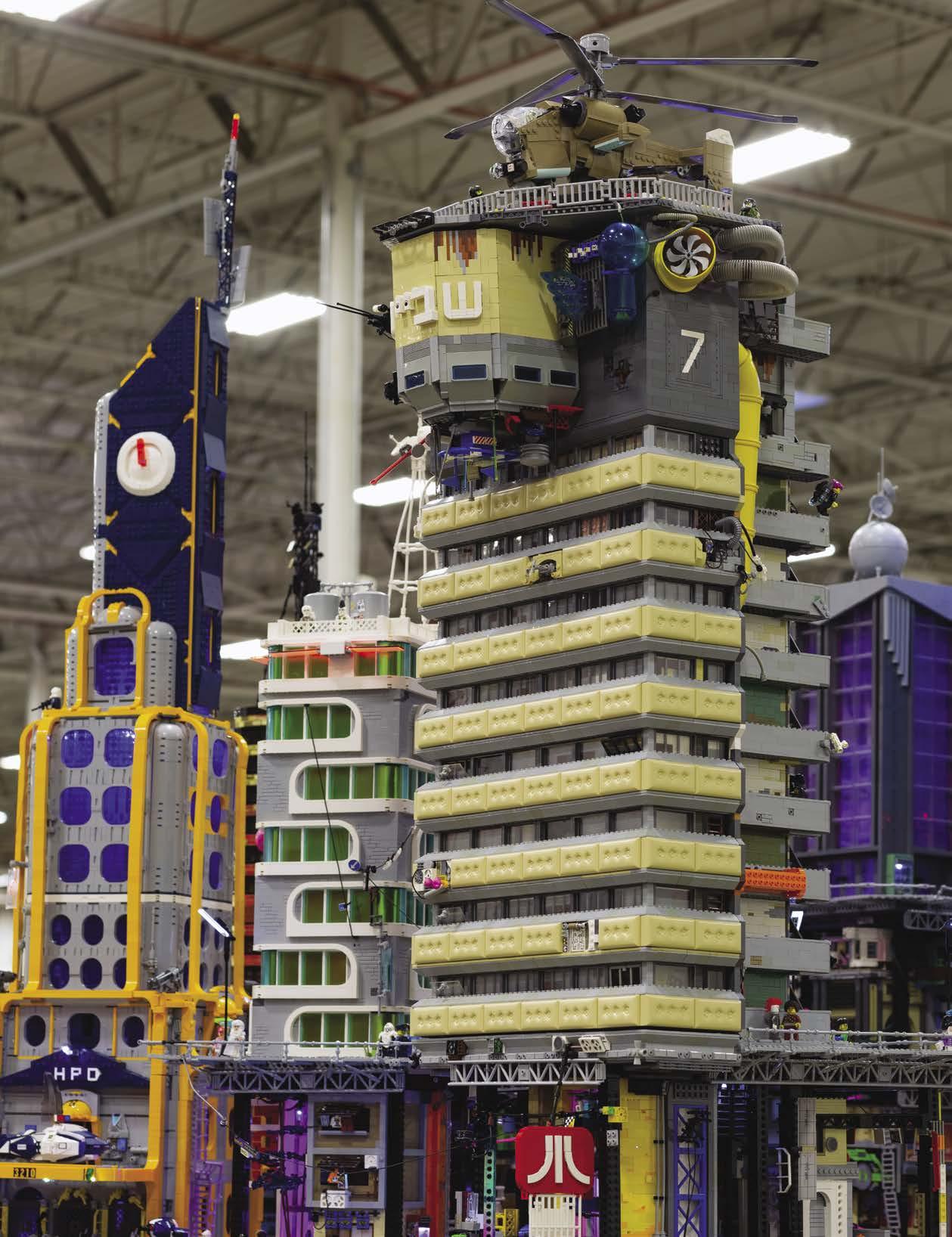 A helicopter Mike previously built served as inspiration for the tower. Photography of Chinese industrial buildings defined the aesthetic he was trying to achieve. He built a helipad that housed a motor to drive the rotors on the chopper, and afterwards the tower body, making this a top-down build.
