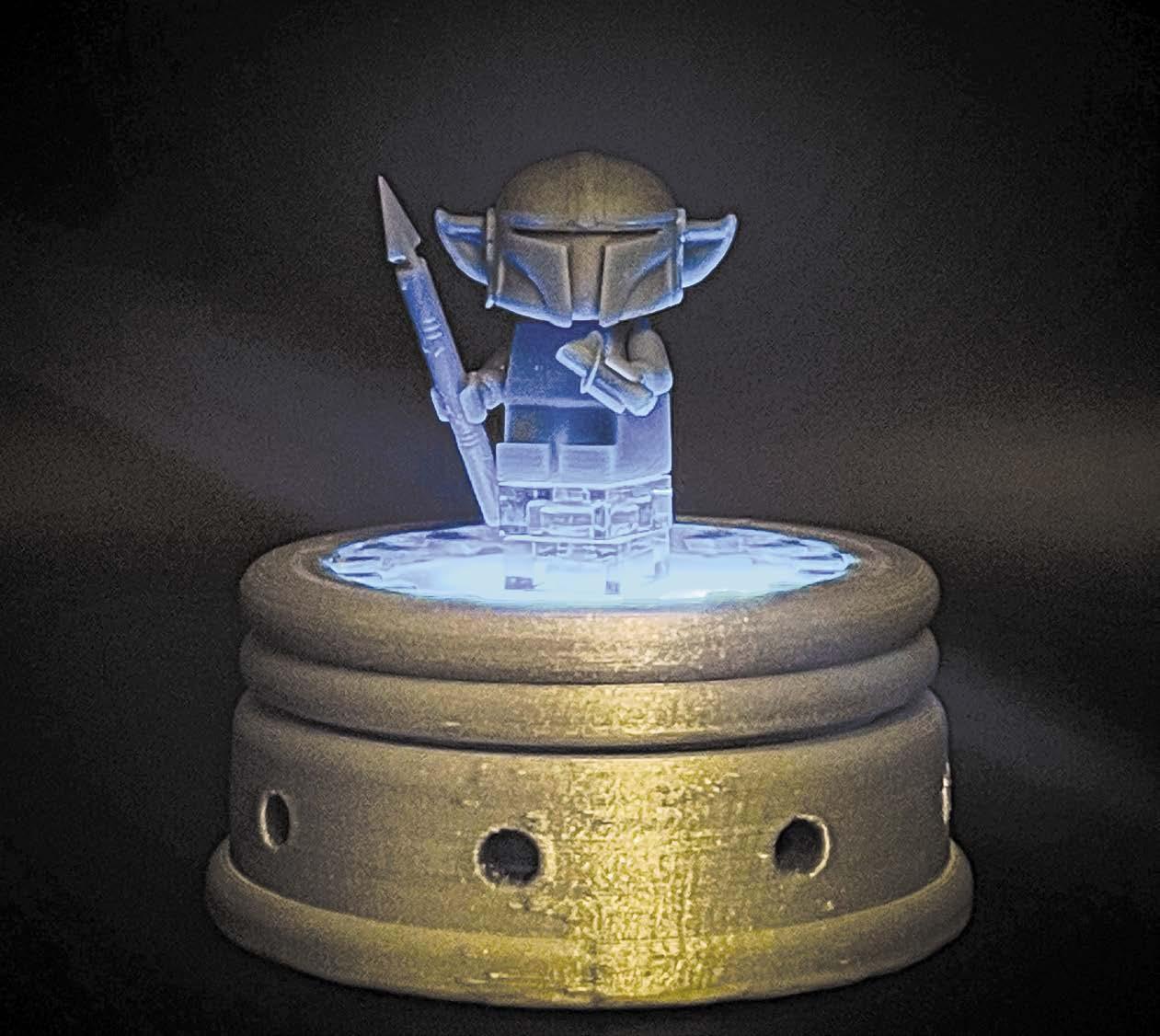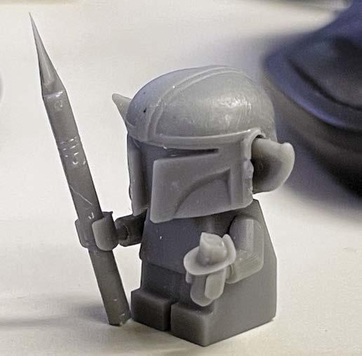 Given that we now have created all these elements, they need to be painted. To finalize the figure, I taped out the legs of the custom baby body. This allowed me to spray paint the torso dark tan, playing off a color in Din Djarin’s outfit. I painted the arms dark red and I left the hands and legs dark grey. I left the hands dark grey (resin color) to avoid paint chipping or rubbing off as the hands flex to hold the various created items. The helmet and spear were painted a silver chrome paint and the Mini-Darksaber was painted black. I used black to paint the visor via a paint brush. In hindsight, I should have painted the visor with black spray paint and then covered it with Silly Putty to mask the black area. This would have allowed me to easily spray the rest of the helmet and have created a sharper edge between the visor and the helmet. Hindsight is always easier, and I mention this here to get you to think about these steps.