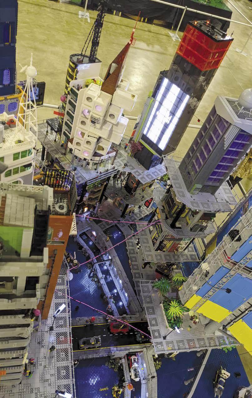 Another element that adds movement and brings the display to life is the monorail, which was modeled from monorails designed by Masao Hidaka. Using the classic LEGO monorail was impossible due to the lack of variety of track pieces. The buildable track provided a perfect solution to route the monorail through the entire layout.