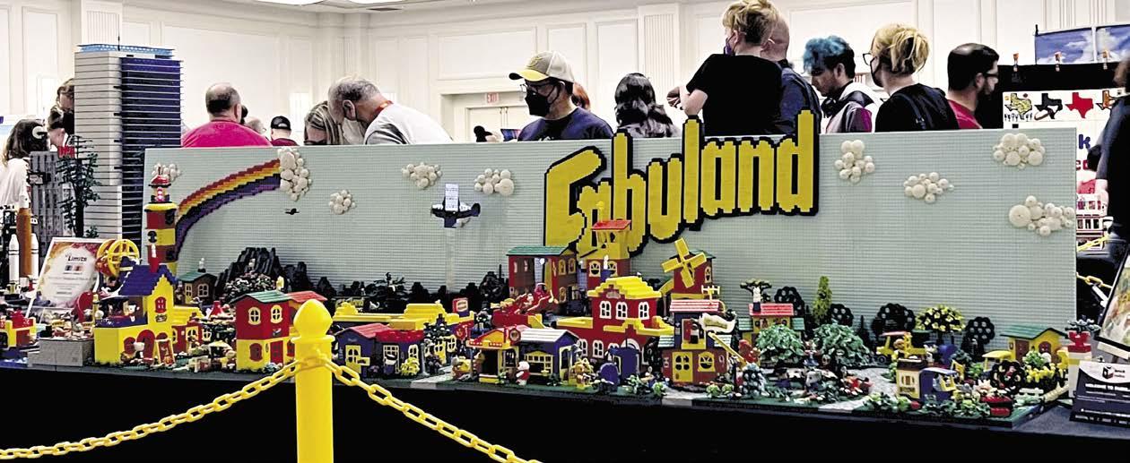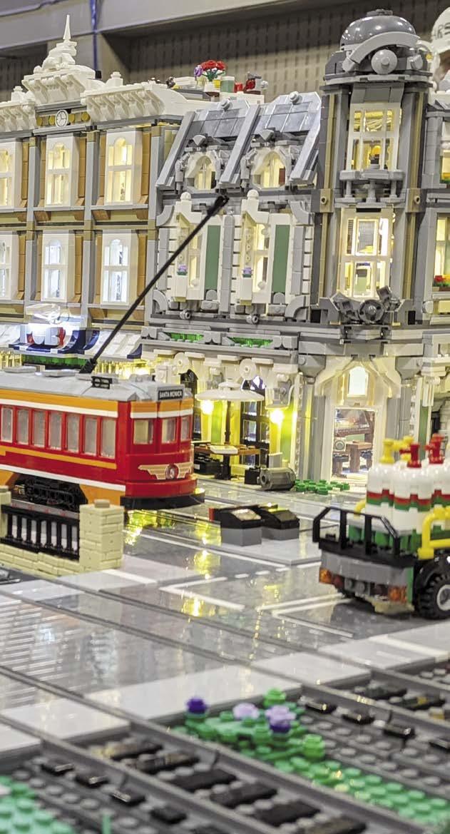 One of the displays seen at Brick Rodeo 2022 was part of a train display by Texas Brick Railroad. This section was a LEGO city block’s length of buildings, with a street and two railroad tracks. Built by both Gareth and Catherine Ellis, this section not only has buildings and landscaping, it also lights up to make a beautiful night scene.