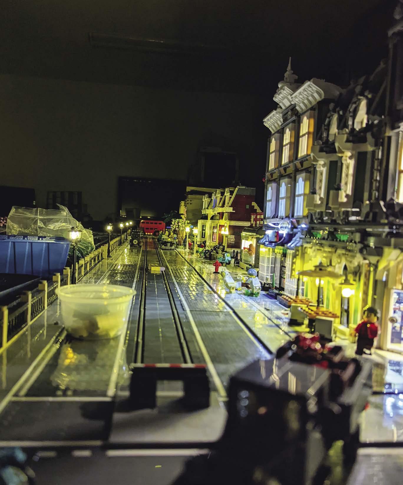 With the lighting system and trolley, the section has constant motion and sound. With the minifigures and vehicles placed on the layout, the town comes to life. Here’s a look at the layout in daylight and night.