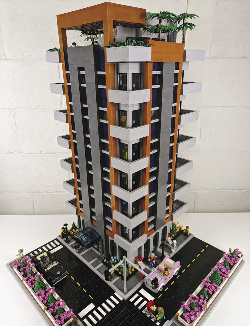 LEGO was one of my favorite toys as a child, since I was interested in becoming an architect one day. My LEGO building stopped in middle school, but returned as a hobby in 2013 when the LEGO modular building line piqued my interest. My focus has been on city building, and I have always wanted to construct a tall building. I slowly acquired parts over the years to build something at this scale, but without an actual design in mind. I started building a proof of concept for the Sky Lofts in December of 2022 and was able to complete the exterior of the building in about two months. I had attempted different designs in the past, but they didn’t work well at the scale I was trying to achieve.