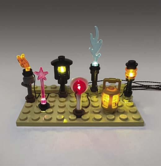 Simply place a pico light (orange, yellow, or warm white) on top of a #86208 Space Gun and then lock it on using a #85861 Inverted Round Plate with Open Stud and place the flame or wave atop. Then attach these to a flicker lighting effects controller (LEC) board to add a realistic flicker. Most of the third party lighting manufacturers sell flicker LECs with three output channels that flicker with slightly different patterns to give several torches a more natural, varied appearance. For large installations, Brickstuff even makes a high capacity flicker LEC with variable flicker intensity that supports 6 and 30 channels. They also sell pre-wired torches with pico lights that flicker all on their own—no separate LEC board required.