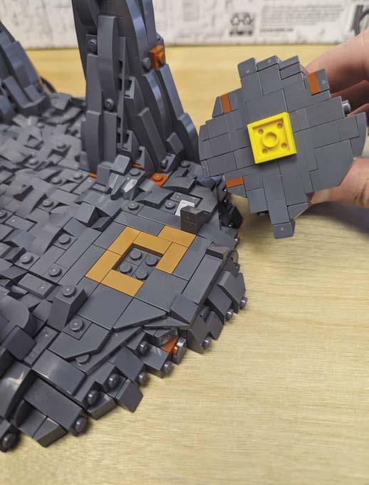 The base is decorated haphazardly with slopes, ingots, plates, and tiles to demonstrate the broken, rocky ground in the show. Utilizing exposed studs was important here. They provide an extra depth and help trick the eye into seeing a craggy surface.