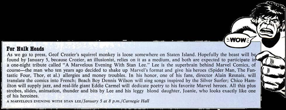 A live show devoted to Lee wasn’t a bad idea, Conway said. “On its face, it made kind of sense, because Stan, at that point, was becoming a pop culture figure. He wasn’t yet the Stan Lee of the [Marvel Cinematic Universe] days, but he had been written up in a number of articles and was well-known by college students.”2 In fact, only months prior, Marvel made it onto the cover of Rolling Stone magazine, proof that Lee’s company was hip and charting high in the zeitgeist of American youth. “And there was a big Marvel fan base, and the idea of some kind of live performance made perfect sense, and doing it at Carnegie Hall was a natural to feed Stan’s ego. And it would have been great if there had actually been anyone involved who had any theatrical or producer experience, and if there had been any way to actually create a cohesive whole out of a bunch of random things that got thrown together. Like a lot of Stan’s work, he needed strong collaborators, for someone to give shape to the material to the ideas that Stan had. And there was no one, as far as I am aware, who had, even remotely, a part of that.”3