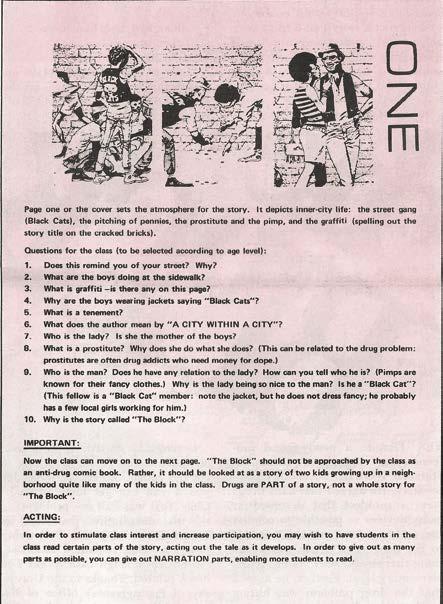 essay in Comixscene #4 [June 1973], he wrote, “[W]hat was needed was a new comic, not about a super-hero or a monster, but about kids on the street, and how drugs affected their lives. It had to be short, and it had to be made available everywhere — on the street, in schools, in public media.”12