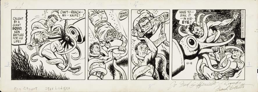 Though Ken Stuart, the strip Frank wrote, penciled, inked, and lettered, was included daily in a major metropolitan newspaper, The Boston Globe (with a Sunday color page every week in some papers), the feature just couldn’t hook the more land-locked accounts into subscribing, despite Frank’s ever-improving artwork and unique nautical storytelling perspective. The cartoonist was only earning about $100 a week from the rigorous, unrelenting seven-day-a-week assignment.