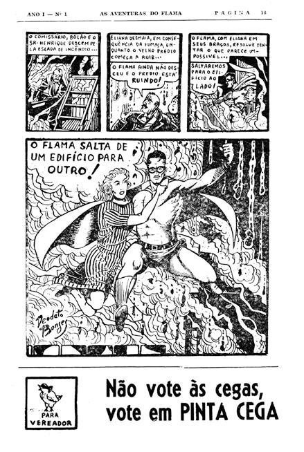 This page: The Brazilian superhero, The Flame, was conceived in 1963 as a radio soap opera (broadcast regionally in the South American country) by the multi-talented Deodato Borges, father of Mike Deodato, Jr. Inspired by Will Eisner’s crimefighter, The Spirit, As Aventuras do Flama featured creator Deodato Borges as the voice of the hero. Soon thereafter, he used his cartooning talents to initiate a comic book version of the radio show, which lasted for five issues after debuting in Mar. 1963. All items on this page are from #1.