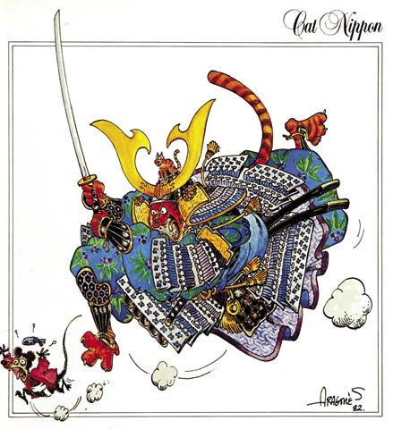 Published by Collier Books, The Secret Life of Cats [1982] is a truly unexpected curiosity in the Preiss oeuvre, no doubt one inspired by the runaway publishing success of B. Kliban’s book, Cat, and its accompanying calendars. Collecting single-page feline-centric illustrations, the book, according to McCall’s magazine, is “the result of 46 artists joining forces… addressing themselves to the question [quoting the book’s introduction]: ‘What does a cat think about all those hours he or she spends sitting on a windowsill, moving only the tip of a tail?’ They give us — besides the expected Fat Cat, Glamour Puss, and Sex Kitten — Cat-Man, Sam Spayed, Poe Cat, Fluff Gordon, and Catanova. (They can’t help themselves, these people.”)92