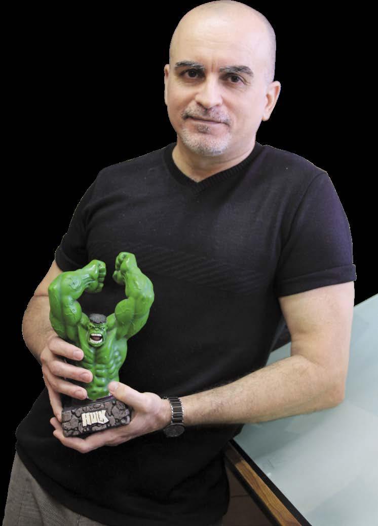 Below: Mike Deodato, Jr., the artist himself, in 2011, holding a statuette of The Hulk sculpted in the Brazilian-born creator’s style.