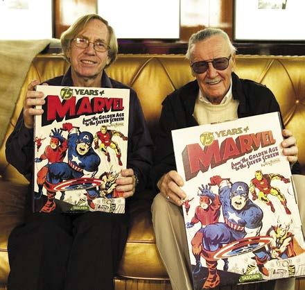 Above: The logo for Stan Lee’s Excelsior comics line, intended to be a sub-imprint of Marvel, which was developed between 1994–96, but was deep-sixed by unknown parties despite much work being completed on the four titles. Inset left: Lee’s bio blurb from the 1996 National Cartoonist Society Album. Below: Roy Thomas (left) and Lee smile for the camera while displaying the massive Taschen-published tome, 75 Years of Marvel [2014].