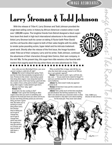 Larry Stroman & Todd Johnson With the release of Tribe #1, Larry Stroman and Todd Johnson provided the single best-selling comic in history by African-American creators when it sold over 1,000,000 copies. The longtime friends from Detroit designed a black superhero team that dealt in high-tech international adventures in the underworld. Artist Larry Stroman built his career on taking X-Factor (with Peter David) and the cult favorite Alien Legion to both of their sales heights with his ability to render pulse-pounding action, hyper detail and his intricate trademark panel work. Shortly after the release of the first issue, the Image founders voted Tribe out of their company. Larry and his writer, Todd Johnson, continued the adventures of their characters through Axis Comics, their own company, in the mid-’90s. To the present day, this super-hero title remains a fan favorite with readers that eagerly await the day when there are new adventures for Tribe. Larry, when you were illustrating X-Factor, your career was just starting to really kick off, right? Stroman: My career’s always been going. That’s just the first time that everybody recognized who I was. Previous to that, shoot, I was having a great time doing Alien Legion. I was doing that book for about seven years. And I was having a good old time. As a matter of fact, at the point at which I stopped doing Alien Legion, I really started to get into it. That was Carl Potts’ baby, right? Stroman: Yeah. So you had a fun time working on that? Stroman: I had a great time working on Alien Legion. Every time you work on something and people for the most part leave you alone and let you do your own thing and they praise you and everything, you have a great time. But when you’re working on something where every five minutes they’re telling you you’ve got to change this, you’ve got to change that, which was what the experience was like working on X-Factor, you start to kind of stall down a little bit.