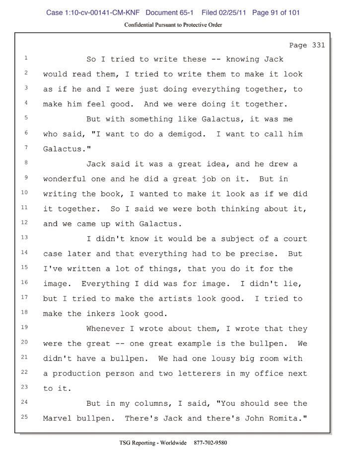 (below) Part of Stan’s heavily redacted deposition from the Marvel vs. Kirby court battle, taking back statements he made in 1974’s Origins of Marvel Comics that might’ve hurt Marvel’s case.