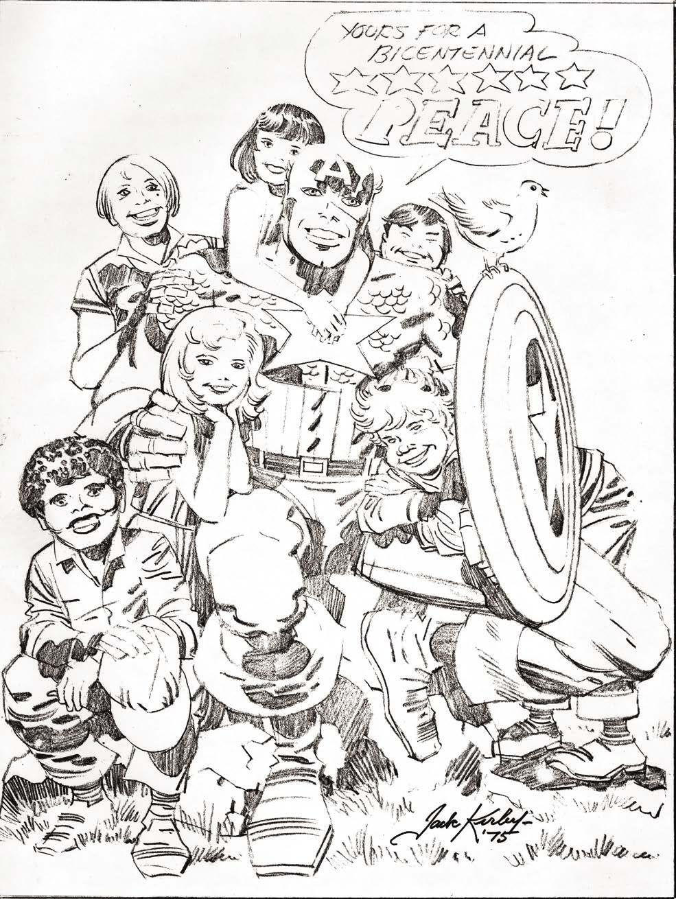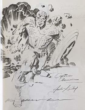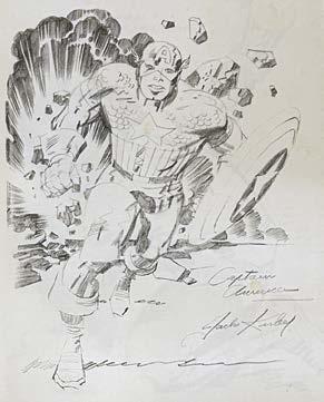Indeed, Jack’s statement included with the piece [next page] not only points to his proclivity for drawing superheroes generally, but gets to his view of humanity itself: “It appears to me that man’s self-image has always spoken more truthfully about him than does his realityfigure. My version of the plaque would have revealed the exuberant, self-confident supervisions with which we’ve clothed ourselves since time immemorial. The comic strip super-heroes and heroines, in my belief, personify humanity’s innate idealism and drive.”