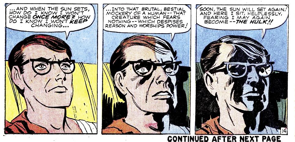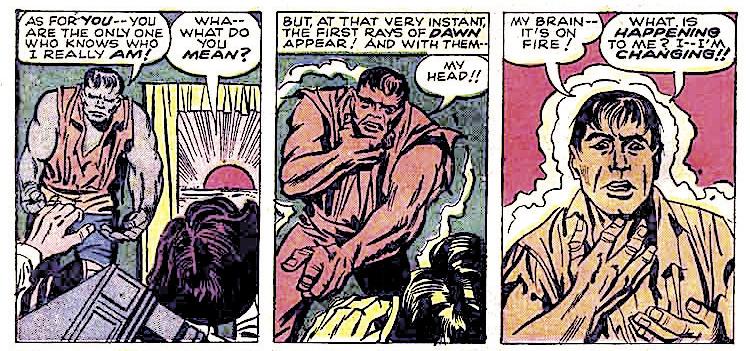 Moving forward to his early work with Marvel, the three-panel sequence generally seemed to be Kirby’s choice to most effectively depict moment-bymoment transformations. As a boy of ten, I quickly noticed this technique in the Hulk’s first issue. 2 On page eleven in the middle tier, the rising sun causes him to revert to Bruce Banner’s human form. Notice that Kirby’s camera eye zooms in closer as the Hulk transitions to Banner. In panel two, his massive torso looms threateningly with hand extended, but by panel three his rapidly changing face is proportionately