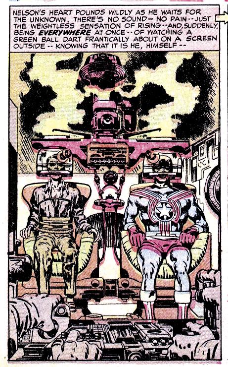 One of Kirby’s remarkable talents as an artist was his ability to depict the transformation of a character from his original state to that of an enhanced super-powered being. A fairly early example is Simon & Kirby’s Fighting American. This character had a unique origin, in that his life essence had been transferred from his own frail body into that of his revitalized brother. 1 This panel features a wondrous piece of Kirby-tech gadgetry, a device that looks capable of actually performing such an astounding operation. As we scan this intricate composition, we first see the top of the machine with bolts of energy dancing around it. Following the tendency of reading from left to right, we initially might overlook the slim figure of Nelson Flagg, as the prominence of the machine’s horizontal red bar takes the eye to the larger and more colorful costumed form of Johnny. However, the semicircular shapes of the seats, as well as the hands below operating the machinery, bring the eye back around to Nelson’s slim unobtrusive shape.
