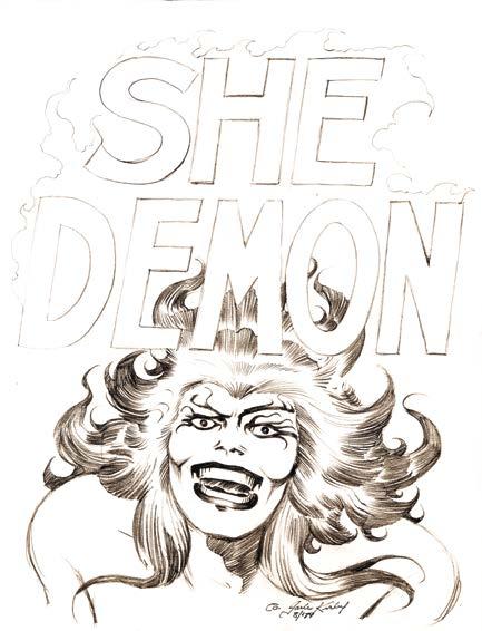 TwoMorrows’ Jack Kirby Collector #56 and #61 published concept art by Jack Kirby, apparently done in August 1979, for a comic-book character called “She-Demon.” She was described in Kirby’s concept notes as a “…terrifying creature that lives deep within the psyche… a primitive force of terrifying power!” and she looks exactly like the early savage She-Hulk, right down to her shock of dark hair, taloned fingernails, savage expression, imposing physique, and the little torn/ ragged dress (courtesy of the Beautiful Dreamer school of fashion