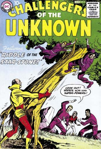 Are there any readers of the Jack Kirby Collector who are not aware of the inking collaborations between The King and the massively talented, but self-destructive illustrator Wally Wood? Unlikely, I know, but just in case you’re a new reader who hasn’t encountered this matchless pairing of talents, let me point you to one of the less appreciated pieces that the duo worked on. For Challengers of the Unknown #5 (Jan. 1959), “The Riddle of the Star-Stone” continued the impeccable work Kirby and Wood had previously essayed in this title with “The Wizard of Time” in the fourth issue of the magazine. While the Challs title is not a superhero book, the cover of this issue might have led unwary readers of the day into making that assumption. It shows a man in a poster-colored red and yellow superhero (or perhaps super-villain) costume tearing up a tree by its roots, and shaking free two of the Challs while the others (including June, the distaff member of the group) crouch nearby. Striking though this cover is, it is perhaps topped by the splash page of the first story [right] which again shows the group at bay—Ace and Rocky are crouching behind a boulder, while heading towards the viewer is a herd of animals running in panic; and the leopard that leaps towards the viewer evokes the cover of 1953’s Adventures In 3-D #1, produced at Harvey Comics alongside Simon & Kirby’s Captain 3-D #1—but who needs 3-D when the impact of a page such as this is created by the best illustrators in the business?