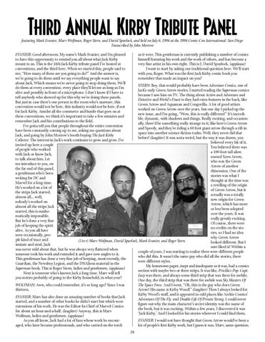 Third Annual Kirby Tribute Panel featuring Mark Evanier, Marv Wolfman, Roger Stern, and David Spurlock, and held on July 6, 1996 at the 1996 Comic-Con International: San Diego Transcribed by John Morrow EVANIER: Good afternoon. My name’s Mark Evanier, and I’m pleased as it were. This gentleman is currently publishing a number of comics to have this opportunity to remind you all about what Jack Kirby himself featuring his work and the work of others, and has become a meant to us. This is the 14th Jack Kirby tribute panel I’ve hosted at very fine artist in his own right. This is J. David Spurlock. (applause) conventions, and the third here. When we started this, people said to I want to start by asking our traditional question here. We’ll start me, “How many of these are you going to do?” And the answer is, with you, Roger. What was the first Jack Kirby comic book you we’re going to do them until we say everything people want to say remember that made an impact on you? about Jack. Which means we’re never going to stop doing them. We’ll STERN: Boy, that would probably have been Adventure Comics, one of do them at every convention, every place they’ll let me as long as I’m Jack’s early Green Arrow stories. I started reading the Superman comics alive and possibly in front of a microphone. I don’t know if I have to because I saw him on TV. The thing about Action and Adventure and tell anybody who showed up for this why we’re doing these panels. Detective and World’s Finest is they had extra features in the back, like But just in case there’s one person in the room who’s unaware, this Green Arrow and Aquaman and Congorilla. A lot of good artists convention would not be here, this industry would not be here, if not worked on Green Arrow over the years, but one day I picked up the for Jack Kirby. Amidst all the commerce and hustle that goes on at new issue, and I’m going, “Wow, this is really different!” It’s incredithese conventions, we think it’s important to take a few minutes and ble, dynamic, with shadows and things. Really exciting, and occasionremember Jack and his contributions to the field. ally, there’d be something really strange in it; like here’s Green Arrow I’ve gotta tell you that people throughout the entire convention and Speedy, and they’re riding a 60 foot giant arrow through a rift in have been constantly coming up to me, asking me questions about space into another science-fiction realm. Well, they never did that Jack, and going by John Morrow’s booth buying The Jack Kirby before! (laughter) It was sorta weird, but the way it was drawn, you Collector. The interest in Jack’s work continues to grow and grow. I’ve believed every bit of it. invited up here a couple You believed there was of people who worked a 100-foot tall alien with Jack or knew Jack, named Xeen Arrow, to talk about him. Let who was the Green me introduce to you, on Arrow of another the far end of this panel, dimension. One of the a gentleman who’s been stories was what I writing for DC and thought at the time was Marvel for a long time. a retelling of the origin He’s worked on a lot of of Green Arrow, but it the strips Jack started, actually was a totally almost all... well, new origin for Green nobody’s worked on Arrow, which has more almost all the strips Jack or less been adopted started, this is matheover the years. It was matically impossible. really greatly exciting. But he’s done a very fine Of course, there were job of keeping the spirit no credits on the stoalive. As you all have ries, so I had no idea seen occasionally, peowhy Green Arrow ple kind of trace and (l to r) Marv Wolfman, David Spurlock, Mark Evanier, and Roger Stern. looked different. But I imitate and steal. Jack sure liked it! Within a was never wild about that, but he was always very flattered when couple of years, I was starting to realize there were different people someone took his work and extended it and gave new angles to it. who did this. It wasn’t the same guy who did all the stories, there This gentleman has done a very fine job of keeping, most recently, the were different styles. Guardian, the Newsboy Legion, and the DNAliens material in the My hometown paper, inept and inadequate as it was, had a comics Superman book. This is Roger Stern, ladies and gentlemen. (applause) section with maybe two or three strips. It was like, Pricilla’s Pop. Capt. Next is someone who’s known Jack a long time. Marv will tell Easy was there, and always some third strip that was there for awhile. you stories probably of going to the Kirby household, in what year? One day, the third strip that was there for awhile was Sky Masters Of WOLFMAN: Aww, who could remember, it’s so long ago? Since I was The Space Force. And I went, “Oh, this is the guy who does Green thirteen. Arrow! His name is Kirby Wood!” (laughter) Then I always looked for Kirby Wood’s stuff, and it appeared in odd places like Archie Comics’ EVANIER: Marv has also done an amazing number of books that Jack Adventures Of The Fly, and Double Life Of Private Strong. I could never started, and a number of other books he didn’t start but which were figure out why the main character’s secret identity was the name of extensions of his work. He was the Editor-In-Chief of Marvel Comics the book, but it was exciting. Within a few years, I discovered it was for about an hour-and-a-half. (laughter) Anyway, this is Marv ‘Jack Kirby.’ And I looked for his stories wherever I could find them. Wolfman, ladies and gentlemen. (applause) As you all know, Jack had a lot of fans whose work he encourEVANIER: I would not have thought that Green Arrow would’ve been a aged, who later became professionals, and who carried on the torch lot of people’s first Kirby work, but I guess it was. Marv, same question. 26