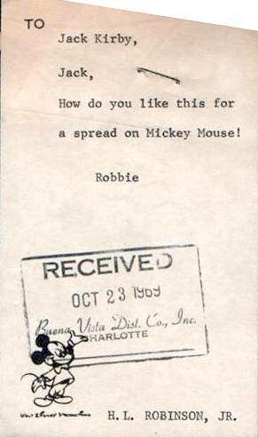 (below) Wesley C Winters, Jr , a dealer in paper memorabilia, came across this interesting artifact in a recent purchase It’s an issue of the Los Angeles Times’ Sunday West magazine supplement, dated October 13, 1968 But while we know Jack contributed an art/prose piece on the Pioneer 10 Jupiter probe to a 1972 issue of West, it’s not this issue that’s Kirbycentric Check out the note to “Jack Kirby” from H L “Robbie” Robinson, dated October 23, 1969 Jack was definitely living in the Los Angeles area by then; was he considering some work for Disney at that time? Or was this directed to a different “Jack Kirby”? If you have any clues, let us know!