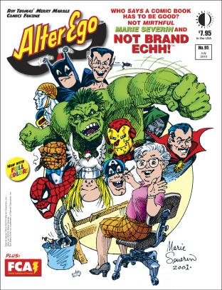 (bottom) ‘Mirthful’ Marie Severin is surrounded by some of her unforgettable Not Brand Echh takes on the Mar vel Super-Heroes in this 2001 self-portrait, which is featured on the cover of the upcoming Alter Ego #95, shipping this July from TwoMorrows It even includes “Rational Comics’ Gnatman” (top left)