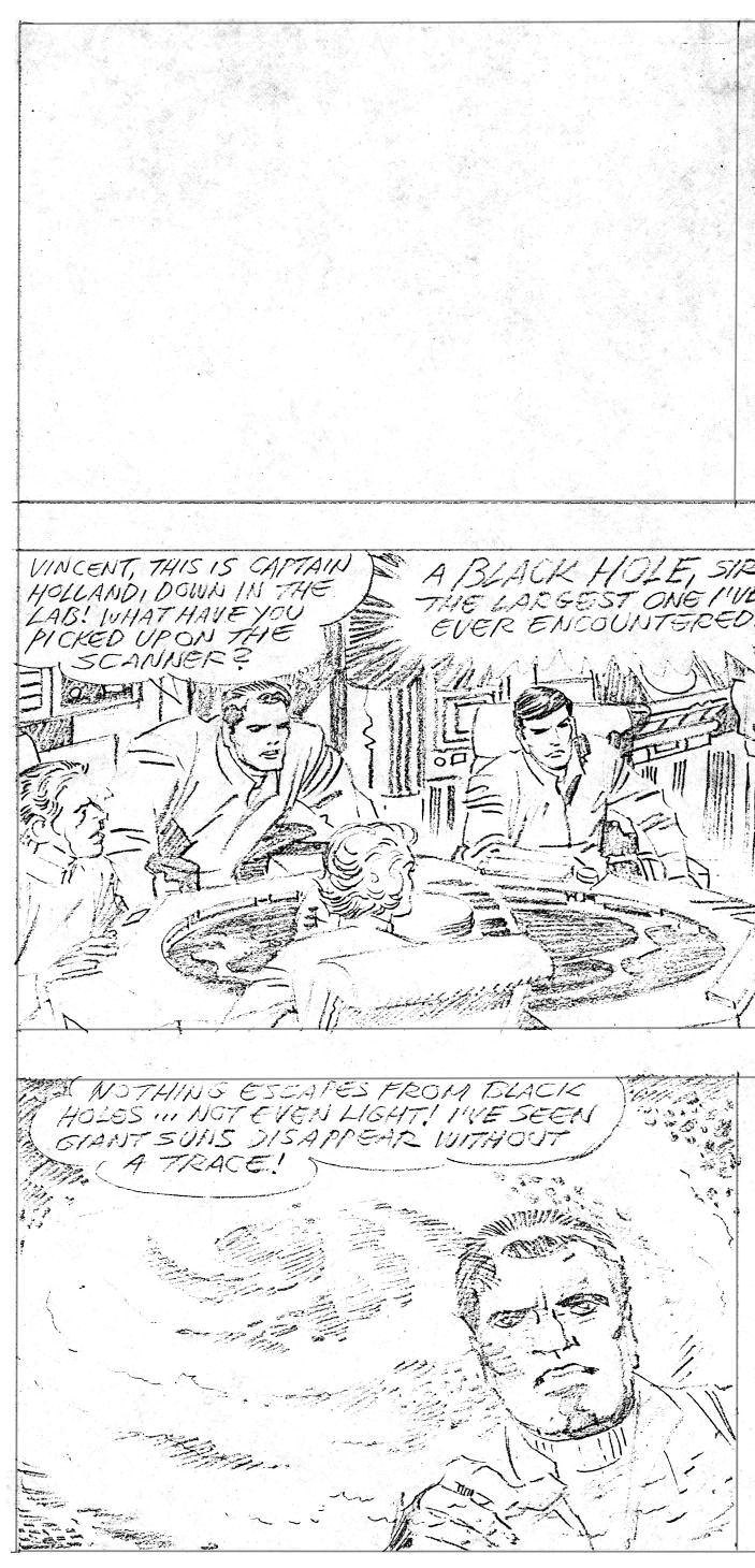 (above)MikeRoyerinks(andminorcorrectionstokeepthecharacters“onmodel”)fromtheSeptember9,1979 BlackHole Sundaystrip.Seethepencilsonpages2-3ofthisissue. BlackHoleTM&©2010WaltDisneyProductions.