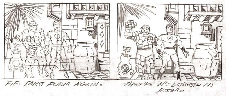 A panel from Fantastic Four #15 survives in pencil form [see next page], showing the so-called “rocky” Thing before Ayers sanded down his hard edges in that issue. The difference is dramatic.