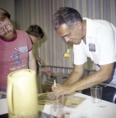 A flurry of photos from the San Diego ComicCon, from Shel Dorf’s archives. Frame 1 shows Marv Wolfman peering over Jack’s head as Mark Evanier looks on. Frame 3 includes (left to right) Steve Leialoha, Marv Wolfman, Jack Kirby, unknown female, Roz Kirby, Len Wein, Mark Evanier, and Marty Pasko. All are from the 1979 Comic-Con, except frame 6 is Jack with Len Wein in 1978.