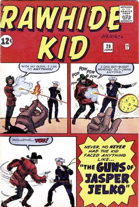 I began to haunt my local newsstand, looking for more Kirby comics. I soon found a magazine whose cover was laid out sequentially, something I’d never before seen. It was Rawhide Kid #28 (June 1962), designed with three panels of classic Kirby continuity. 2 Here, we see the artist foreshadow the story by displaying Jelko’s mastery of marksmanship, shooting out a lit match in the first panel, plugging a coin several times in the second, and finally turning his revolver on the Kid. Notice how the hand in panels one and two balance the page by gesturing towards the Rawhide Kid.