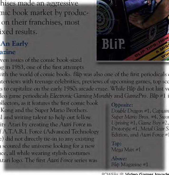 Marvel produced seven issues of the comic book-sized magazine Blip beginning in 1983, one of the first attempts to tie-in video games with the world of comic books. was also one of the first periodicals dedicated solely to video games, mixing interviews with teenage celebrities, previews of upcoming games, top scores reported by mail, and tips and tricks to capitalize on the early 1980s arcade craze. While did not last very long, it helped set the stage for the video game periodicals #1 is of particular interest to back issue collectors, as it features the first comic book appearance of Donkey Kong and the Super Mario Brothers. DC used its editorial and writing talent to help out fellow Time Warner commodity Atari by creating the 1982. The characters of A.T.A.R.I. Force (Advanced Technology And Research Institute) did not directly tie-in to any existing video games. The team scoured the universe looking for a new home for the human race, all while wearing stylish costumes emblazoned with the Atari logo. The first