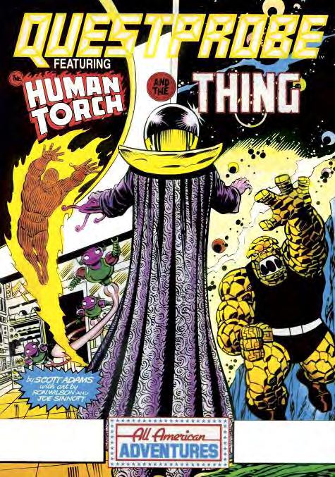 One of the first successful tie-in venues pursued in the early days of video gaming, Scott Adams’ Questprobe series, was released in 1984 for the Atari 800 and Apple II. Questprobe used wellknown Marvel characters to appeal to the home computer gaming crowd. The Questprobe games mixed Al Milgrom’s art with Scott Adams’ design and story for a series of three games starring Spider-Man, the Hulk, and the duo of the Human Torch and the Thing. Marvel produced a Questprobe three-issue limited series, which features work by John Byrne, Mark Gruenwald, and John Romita. The Questprobe series marks the first effort to create a comic book that tied in directly to a video game. A fourth game and comic was planned, featuring the X-Men, but it was never released due to the bankruptcy of the Questprobe video game publisher, Adventure International, during the video game industry collapse of the mid-1980s. The comic art created for the