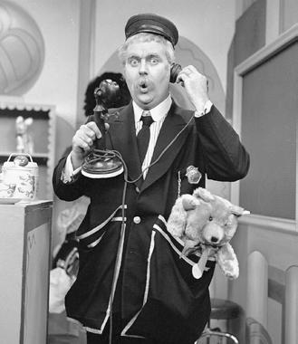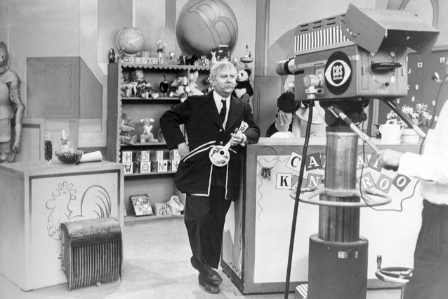 Captain Kangaroo waiting to go live in the early days of the show. The word “yawn” is spelled out in small blocks on the shelf.