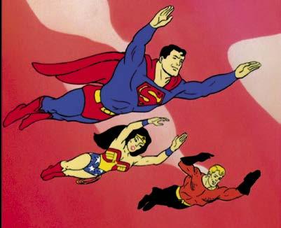 (CLOCKWISE) Super Friends (or SuperFriends, in this incarnation) Superman, Hawkman, Wonder Woman, Robin, Batman, the Flash, Green Lantern, and the King of the Seas, Aquaman, who has somehow gained the power of flight (maybe he just leapt like a flying fish out of the Hall of Justice’s fountain in the background…). TM & © DC Comics.