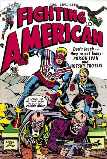 (LEFT) Yes, that’s Kirby himself, on the wrong side of the law, on the photo cover of Prize Publications’ Headline Comics #37 (Aug.–Sept. 1949). © 1949 Prize Publications. (CENTER) Poison Ivan and Hotsky Trotski don’t stand a chance against Simon & Kirby’s patriotic, Commie-crushing hero. Fighting American #3 (Aug.–Sept. 1954). (RIGHT)