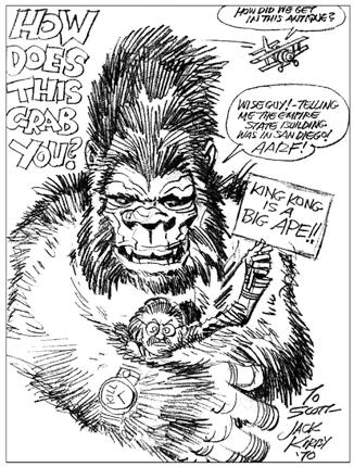 The second time I met Jack was at his home in SoCal’s Thousand Oaks, along with my other teenage San Diego Comic-Con co-originator pals in 1971. I blurted out, “Jack Kirby!?! You’re my favorite cartoonist!” Surprisingly, Jack seemed quite pleased to be described by that simple term, usually applied to those of us who write and draw nothing but the funny stuff. After all, comics aficionados have dubbed him “King” Kirby (a title he wore with some discomfort), and have compared his work to that of Da Vinci, Rembrandt, and Rockwell, among other artistic greats. I suppose that’s because Jack probably saw himself as a cartoonist, partially because he wrote the stories he drew. A few weeks later, he sent me a penciled caricature of myself getting strangled by King Kong (see inset).