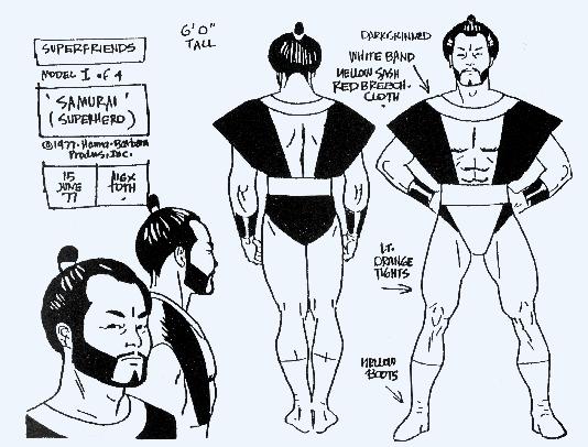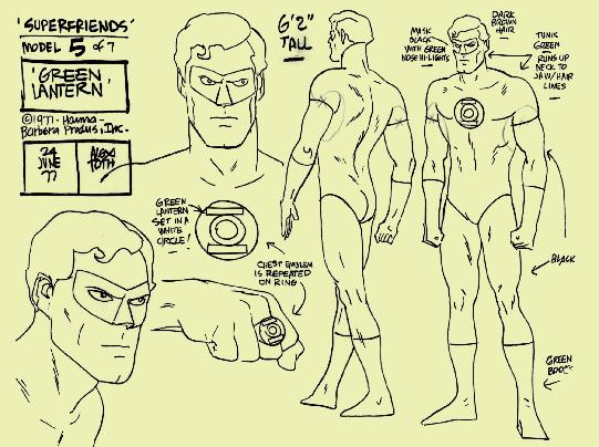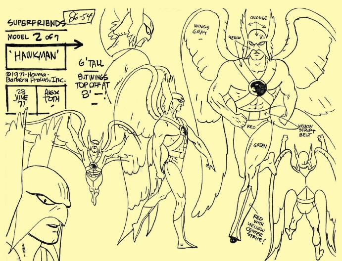 (TOP LEFT) Model sheet for Green Lantern. (TOP RIGHT) The Super Friend known as Samurai. (LEFT) Classic hero Hawkman in awesome hero poses. (BELOW) Superman, Wonder Woman, and (somehow) Aquaman fly into action. TM & © DC Comics.