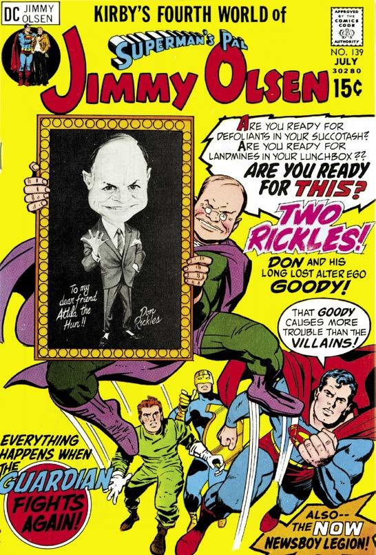 When Jack relocated to DC Comics in the early Seventies, he brought his sense of humor with him. Comedian Don Rickles’ lookalike “Goody Rickels” first appeared in Superman’s Pal, Jimmy Olsen (hereafter JO) #139 (July 1971), and the second and final installment of the Goody Rickels saga, JO #141 (Sept. 1971), bore what possibly remains the greatest comic-book cover blurb of all time: “Kirby Says: Don’t ask! Just buy it!” [Editor’s note: Issue #140, published between the Rickels’ story’s two parts, was a giant issue with Jimmy Olsen reprints.]