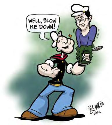 Going through the Watertown public school system was difficult. I was brutally bullied for being involved in art and theater. I was tossed against lockers, tripped in the halls, pushed down flights of stairs, and had gum thrown in my hair. I would come home very depressed, but thankfully a Popeye theatrical cartoon was always waiting for me to watch on WMUR-TV’s The Uncle Gus Show. I would put a sketchpad on my lap and attempt to draw what I was watching. At an early age I recognized what the word “animator” meant, and it was this person, or persons, who decided what Popeye looked like in a particular film. When I discovered the book Popeye the Sailor by Nostalgia Press (1971) and the work of the sailor’s creator E. C. Segar, a new Popeye universe had opened up for me. From Segar I read the works of Bela Zaboly, Tom Sims, and Ralph Stein. Each of these talented individuals put their own spin on Popeye’s comic strip adventures.