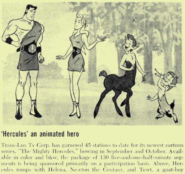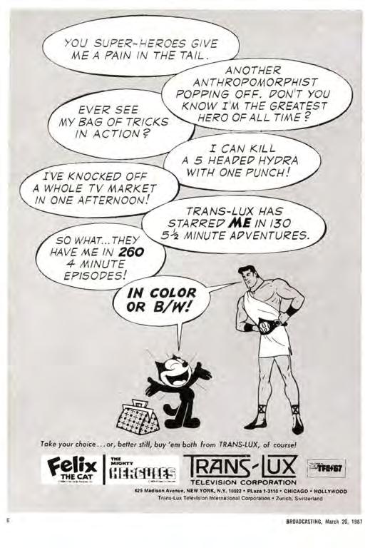 (LEFT) 1963 trade journal clipping touting the premiere of The Mighty Hercules. (BELOW) During the super-hero craze of the mid-Sixties, Hercules shared this 1967 trade ad with the wielder of the bag of tricks, Felix the Cat. Felix the Cat © Dreamworks Animation LLC. The Mighty Hercules © Classic Media. Courtesy of Will Murray.
