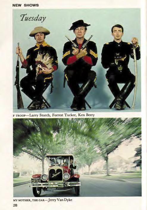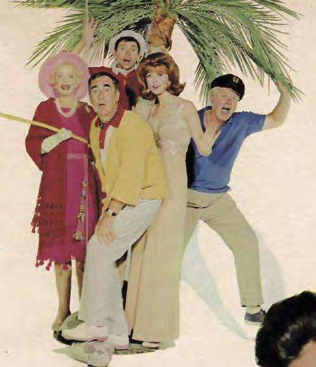 (LEFT) By 1965, Fall Previews eschewed group shots for separate photos of new shows and their stars. © TV Guide. (BELOW) Gilligan’s Island and its earworm theme song premiered in 1964. Tina Louise’s contract stated that she would be billed fifth in the roll call of castaways, and that nobody would be billed after her (perhaps so her name, being the last one heard, would be remembered). Russell “Professor” Johnson and Dawn “Mary Ann” Wells arrived late to negotiations to find their characters couldn’t be named before or after Louise’s, so they became “… and the rest.” Fortunately, the song was corrected by the next season and the duo got their well-deserved name-check. (Source: televisionacademy.com.) Gilligan’s Island © Warner Bros.