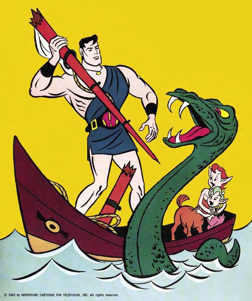 (ABOVE) Behold, RetroFans, as the Mighty Hercules defends Newton and Tewt from a sea serpent (Cecil’s disagreeable cousin, perhaps?). Detail from the cover of Gold Key Comics’ The Mighty Hercules #1 (July 1963). Artist unknown. The Mighty Hercules © Classic Media.