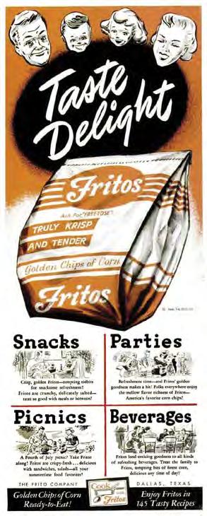 (RIGHT) A Fritos magazine ad from 1949, aimed at families and minus mascots. © Frito-Lay. Via Archive.org.