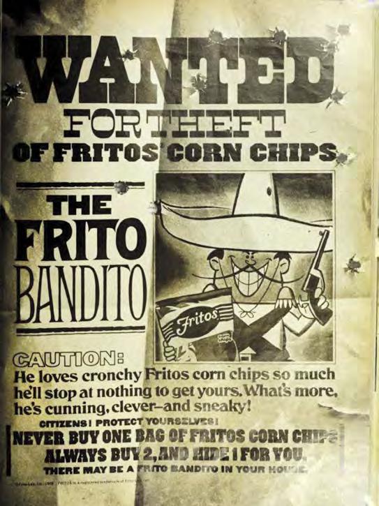 The Bandito was dressed in a simple white outfit and armed with a couple of pistols. He had two bandoliers wrapped across and around his chest. His smile was menacing, highlighted by a gold tooth, and adorned with a long, pencil-thin mustache. He was unshaven and wore a large sombrero. He spoke with a very exaggerated South of the Border accent. And—at gunpoint—the Bandito wanted to take your Fritos, which he liked because they were “croonchy.”