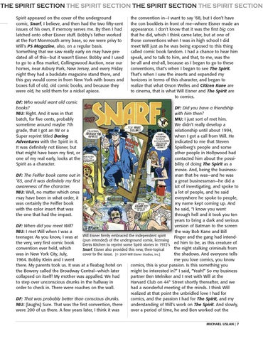THE SPIRIT SECTION THE SPIRIT SECTION THE SPIRIT SECTION THE SPIRIT SECTION Spirit appeared on the cover of the underground comic, Snarf, I believe, and then had the two fifty-cent issues of his own, if memory serves me. By then I had latched onto other Eisner stuff. Bobby’s father worked at the Fort Monmouth army base, so we were privy to Will’s PS Magazine, also, on a regular basis. Something that we saw really early on may have predated all of this—but it wasn’t Eisner. Bobby and I used to go to a flea market, Collingswood Auction, near our homes, near Asbury Park, New Jersey, and every Friday night they had a backdate magazine stand there, and this guy would come in from New York with boxes and boxes full of old, old comic books, and because they were old, he sold them for a nickel apiece.