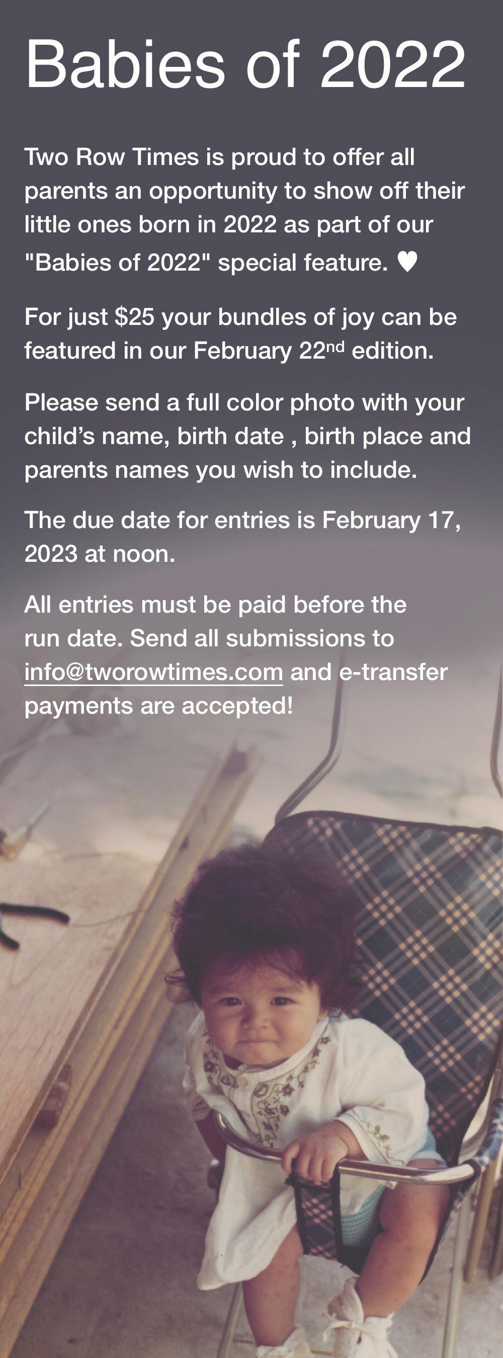 TWO ROW TIMES February 1st, 2023 2 LOCAL keeping you informed. SOUP FO R SENIORS Seniors Gathering Free for Six Nations Elders and Seniors (age 55+) G a t h e r i n g P l a c e b y t h e G r a n d ( 2 5 9 3 C h i e f s w o o d R d . , O h s w e k e n ) F e a t u r i n g d o o r p r i z e s , i n f o r m a t i o n b o o t h s , a n d B I N G O ! C a t e r e d m e a l N o r e g i s t r a t i o n r e q u i r e d F i r s t c o m e , f i r s t s e r v e d w h i l e q u a n t i t i e s l a s t FEBRUARY 7, 2023 11am-1pm COMMUNITY AWARENESS 2023 CALL OUT 2023